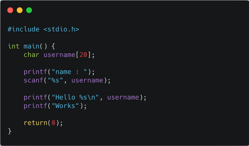 char username[20] — ეს ის ადგილია სადაც განვსაზღვრავთ ცვლადის სახელს, მაგრამ ამ ხაზში ყველაზე მნიშვნელოვანია char …. [20] ეს არის ის ადგილი სადაც განვსაზღვრავთ buffer-ს ჩვენი ცვლადისთვის, ჩვენ განვუსაზღვრეთ მას ზომა, რომელიც 20 ის ტოლი უნდა იყოს.