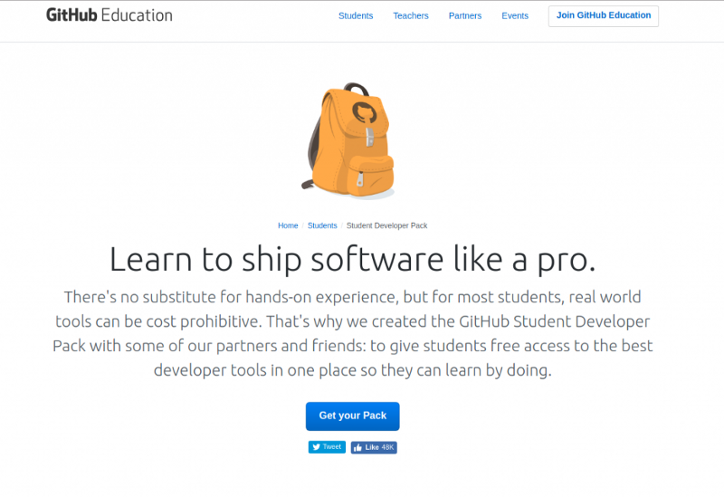 Github — ზე რეგისტრაციის შემდეგ, education pack ის მისაღებად გადადით ლინკზე და დააკლიკეთ Get your pack — ს.